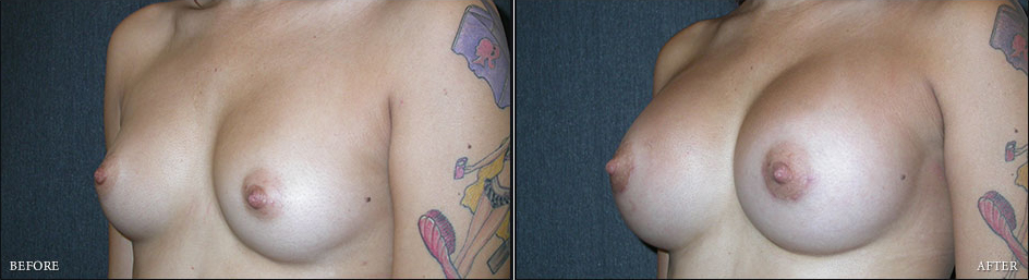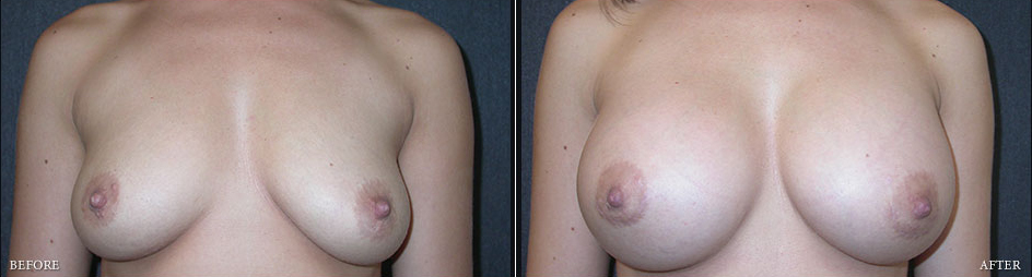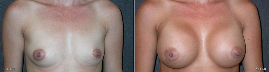 This young mother wanted to increase the size and fullness of her breasts, while maintaining a natural appearance. 350 cc smooth round implants were used, with peri-areolar incisions.